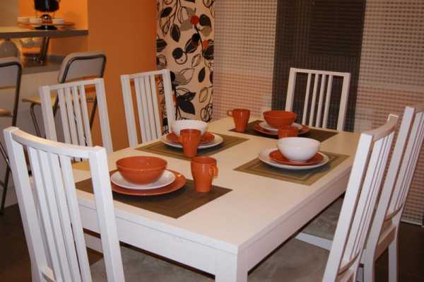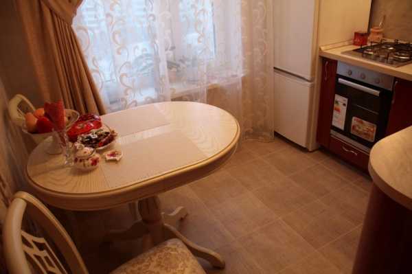 В качестве напольного покрытия следует отдавать предпочтение кафельной или керамической плитке, ламинату, линолеуму. В обеденной зоне будет уместен красивый коврик, повторяющий форму стола.