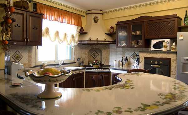 Окна следует украсить красивыми шторами или занавесками, нужно подобрать соответствующую люстру, важным элементом кухни также может стать фартук (для его отделки отлично подойдет керамическая мозаика).