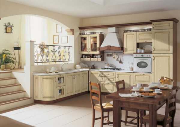 Особую уютную атмосферу на кухне создают мелочи: кран под старину, потёртая плитка, баночки и корзины.Для украшения стен можно использовать небольшие картины, панно, часы. Прекрасным декоративным элементом кухни станет посуда, расставленная на открытых полках или в серванте за стеклом.