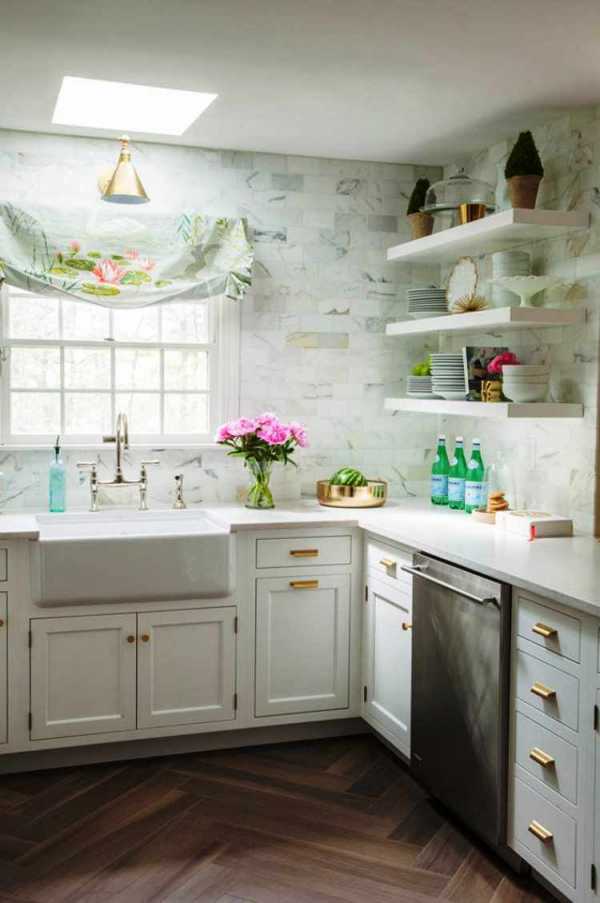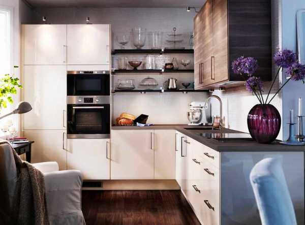 Чтобы маленькая кухня выглядела просторнее, желательно использовать светлые тона.В маленьких помещениях отлично смотрятся подвесные шкафы и полки. Рекомендуется выбирать максимально высокие стеллажи, упирающиеся в потолок, чтобы сэкономить место в помещении.