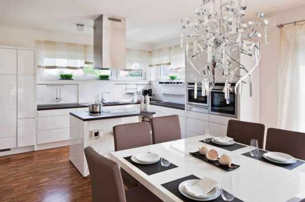 Используя комбинированное освещение, можно осветить все уголки кухни.Чтобы сделать кухню-гостиную еще более красивой, рекомендуется использовать некоторые дополнительные архитектурные элементы. К примеру, обеденный стол со стульями можно расположить на лоджии, присоединенной к кухне.