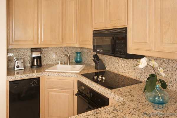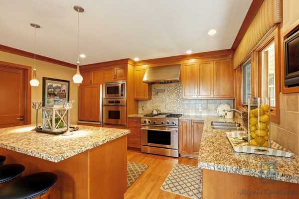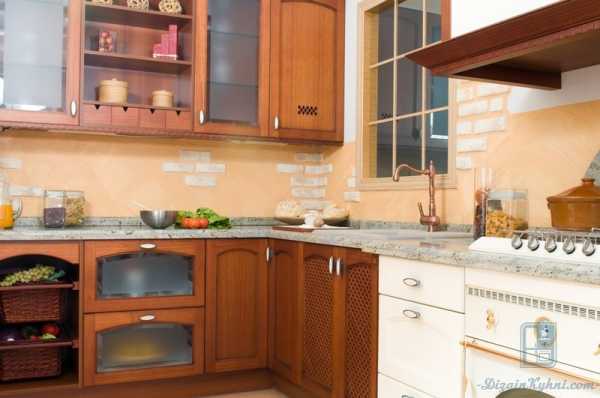Деревянная кухня с каменной столешницей создаёт впечатление надёжности и уверенности.Выбор цветовой гаммы — чтобы кухня выглядела привлекательно всегда, независимо от веяний моды, в отделке интерьера стоит отдавать предпочтение теплым, спокойным и неброским тонам.