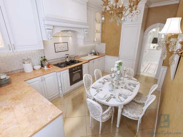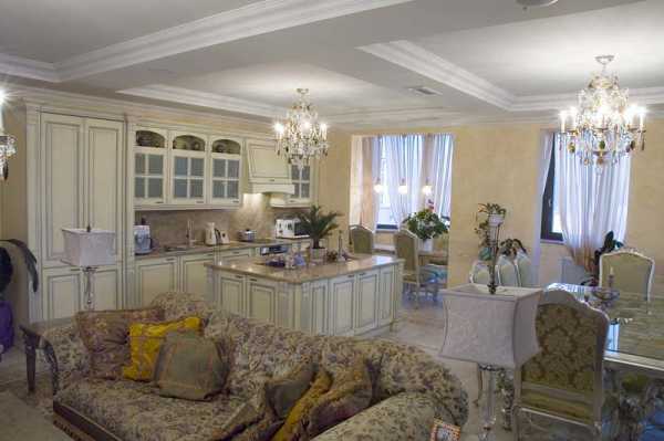 Его основное достоинство – это роскошь и сдержанность. В интерьере преобладают светлые оттенки: бежевый, белый, цвет слоновой кости с элементами позолоты. Фасады мебели украшены красивыми молдингами, резными фактурными узорами, изысканной фурнитурой. Используются только натуральные материалы: дерево, стекло, кожаная обивка мебели. На стенах часто можно увидеть обои в полоску, а на окнах – шторы с ламбрекенами. Такая кухня роскошная и утонченная одновременно, сочетающая королевский шик и сдержанность. Обычно такой дизайн можно увидеть в частных домах, замках или в квартирах-сталинках.