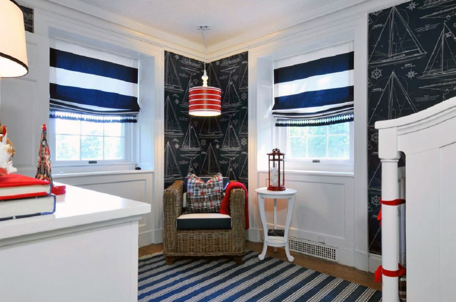 Для штор используют легкие муслиновые ткани, иногда жалюзи.Морскую романтику и тягу к далеким странствиям никто не отменял. Больше всех мечтают о приключениях ребята. Детская, оформленная в морском стиле, станет для них сказкой странствий.