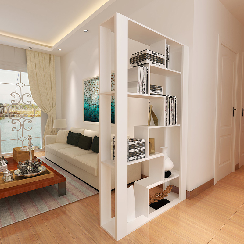 Перегородки, которые дизайнеры называют функциональными или эргономичными, могут быть со стеллажами, книжными полками, а со стороны кухни они могут вмещать в себе полки для посуды.