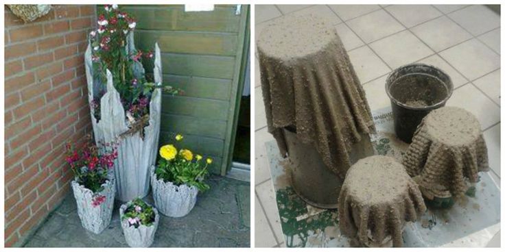Популярными стали самодельные емкости, сделанные из бросовых ведер, банок, кастрюль, из цемента и ненужной тряпки. Художественно замотать тряпкой емкость, сделать складки и драпировки несложно. Останется только высушить и облагородить. Для это красят заготовку любой краской с любой цвет, и, если есть желание, наносят последние штрихи в зависимости от задумки.