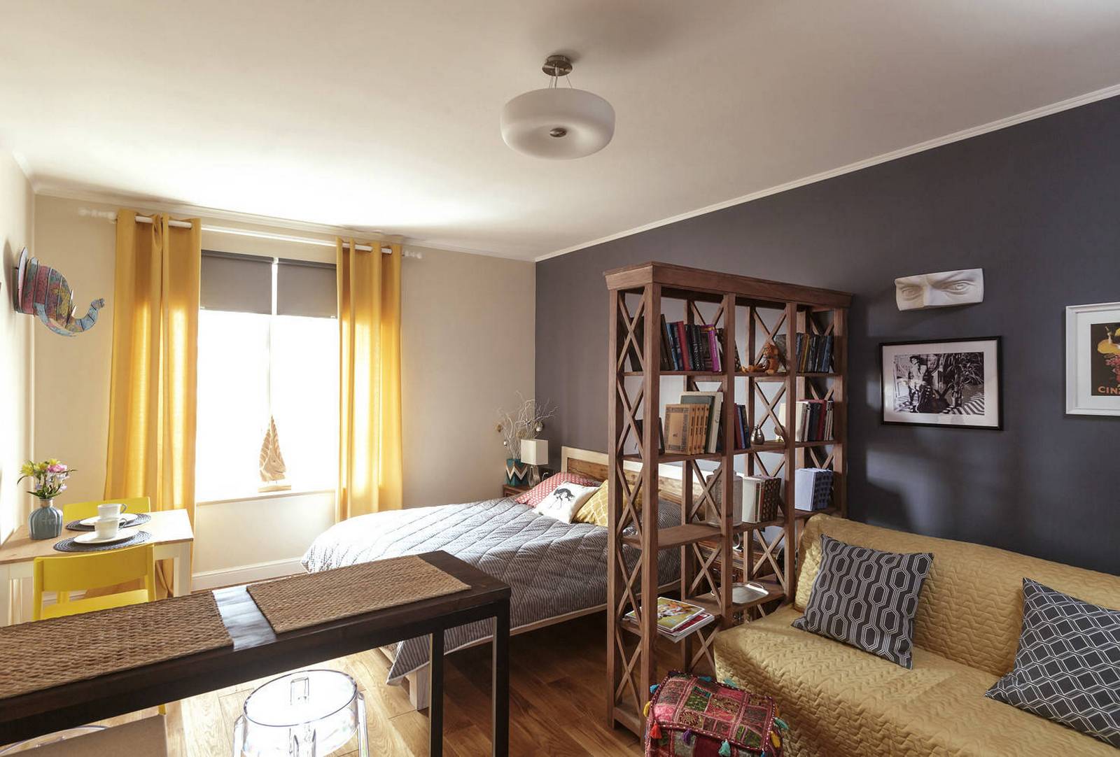 Раскладной диван, расположенный здесь, образует зону гостиной, а также выполняет функции спального места.