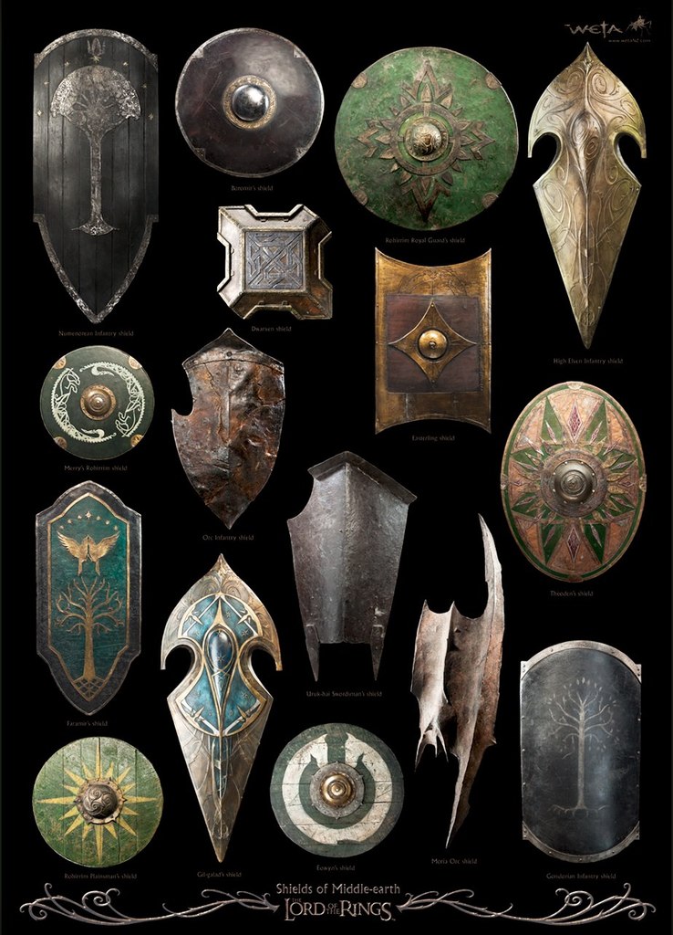 Щиты обрабатывались иначе, чем другое оружие, возможно, потому что они были такими одноразовыми. Щиты, видимо, не были названы, в пути это были мечи, кольчуга и другое оружие.
