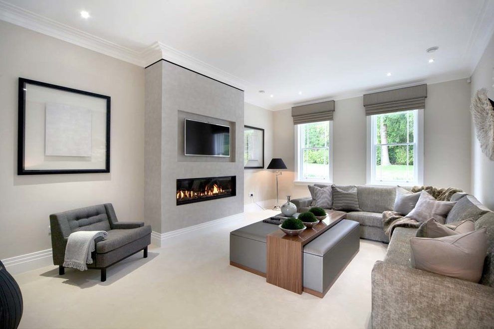 Современная гостиная с камином, в абсолютном большинстве случаев, будет представлена в стиле модерн.