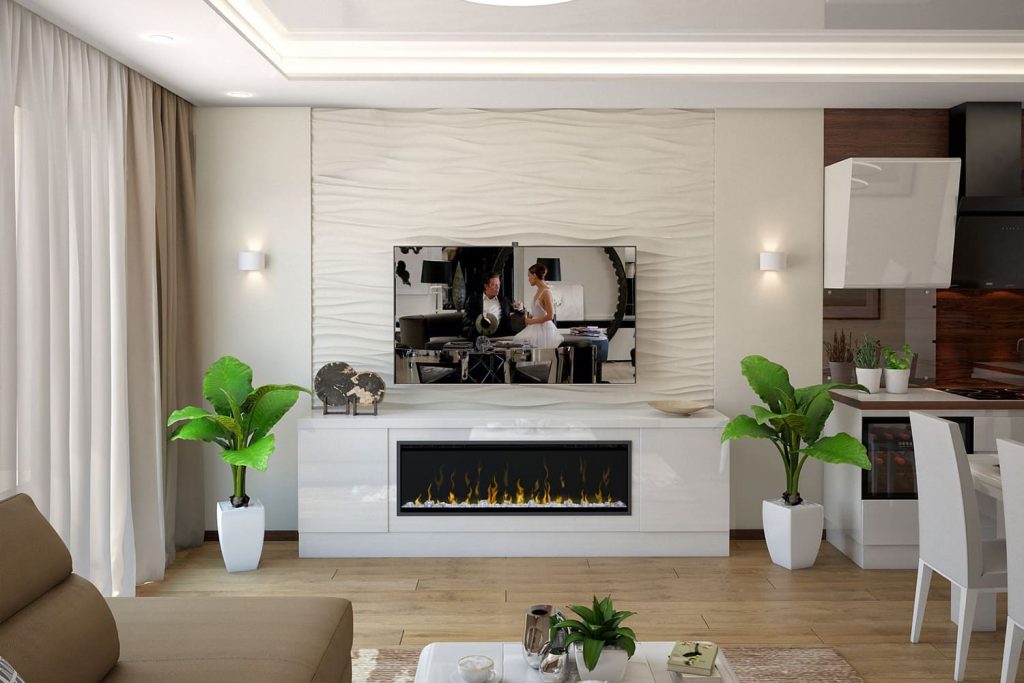 Дизайн проект гостиной с камином также будет гармонично работать с экраном, если поместить его под телевизор.