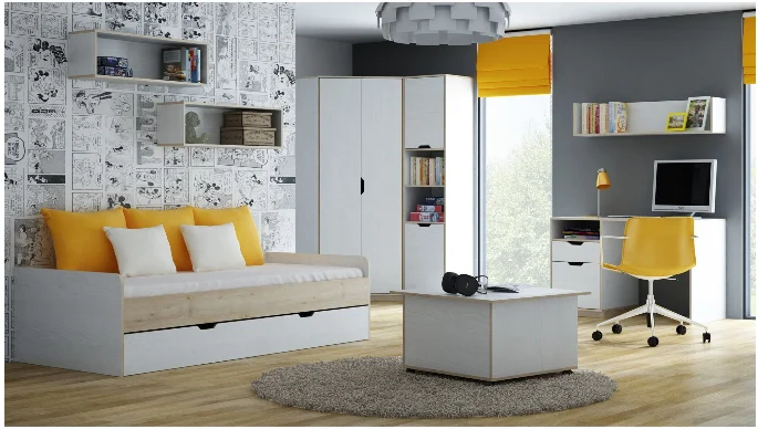 Для коллекции подобран декор Ясень Анкор светлый с текстурой натуральной древесины, с мягким и теплым оттенком, поэтому и зимой, и летом в такой светлой спальне будет уютно. Яркую индивидуальность диванчику-кровати ADELE придают толстые кроватные опоры (49 мм) и изящный вензельный рисунок на изголовье в тон кроватным опорам, выполненный УФ-печатью. Серию дополняют вместительные шкафы, которые позволят разместить в комнате весь гардероб принцессы. Глубина шкафов в молодежной серии 400 мм. Если Ваша комната позволяет расставить большую глубину, предлагаем рассмотреть вариант шкафной группы из спальни, где глубина шкафов составляет 590 мм.