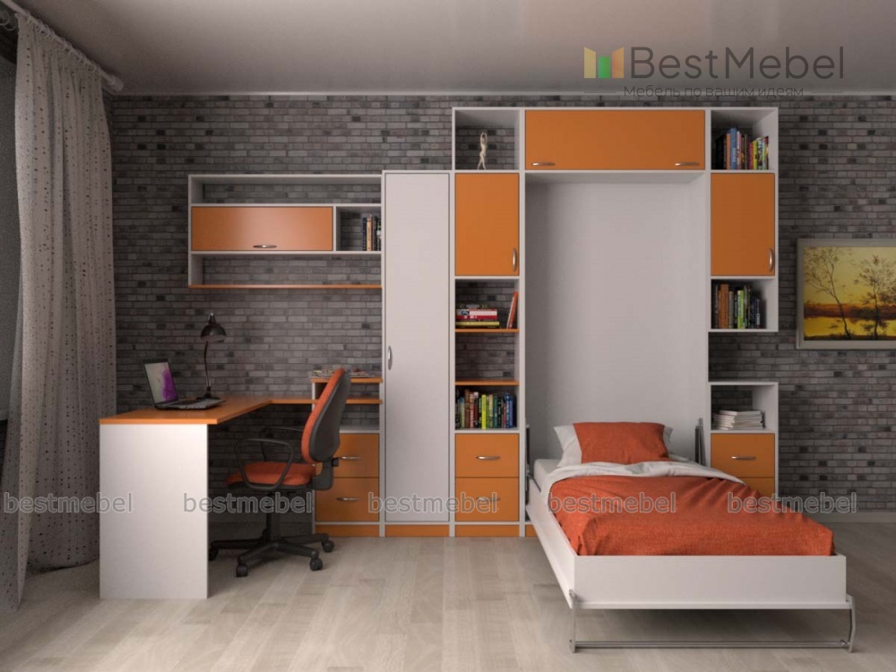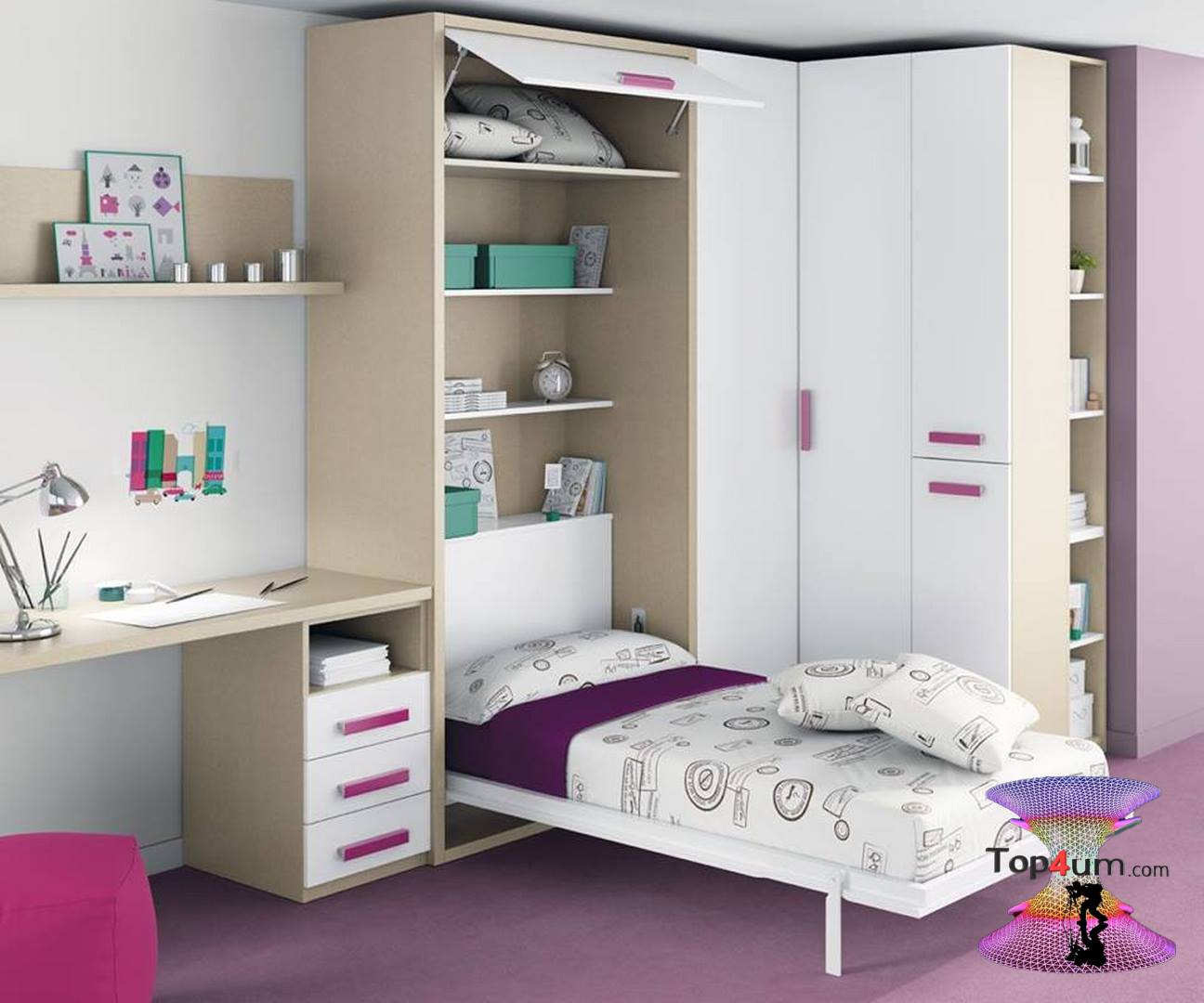 Данный вид мебели-трансформер для подростков является последним изобретением дизайнеров мебели, которые не перестают удивлять своими новшествами. На одном участке пространства устанавливается кровать, перевернув или подняв которую вы получите удобный письменный стол со всеми необходимыми дополнениями. Дополнения чаще всего представлены в виде выдвижных ящиков и тумбочек для хранения мелких вещей, канцелярии и книг.