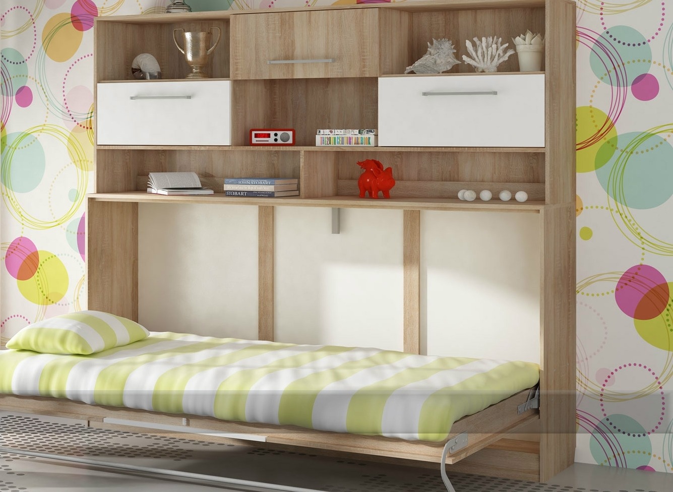 Кровать для детей такого типа устанавливается у стены и имеет качественный подъемный механизм. Механизм позволяет зафиксировать кровать при поднимании в любом положении на любой высоте, поэтому ваш ребенок не травмируется, если при складывании кровати она выскользнет из рук. Поднимаясь кверху, кровать устанавливается в специальную нишу, превращаясь в компактный шкаф. Кровать может также трансформироваться в комод, если речь идет о горизонтальном подъеме.