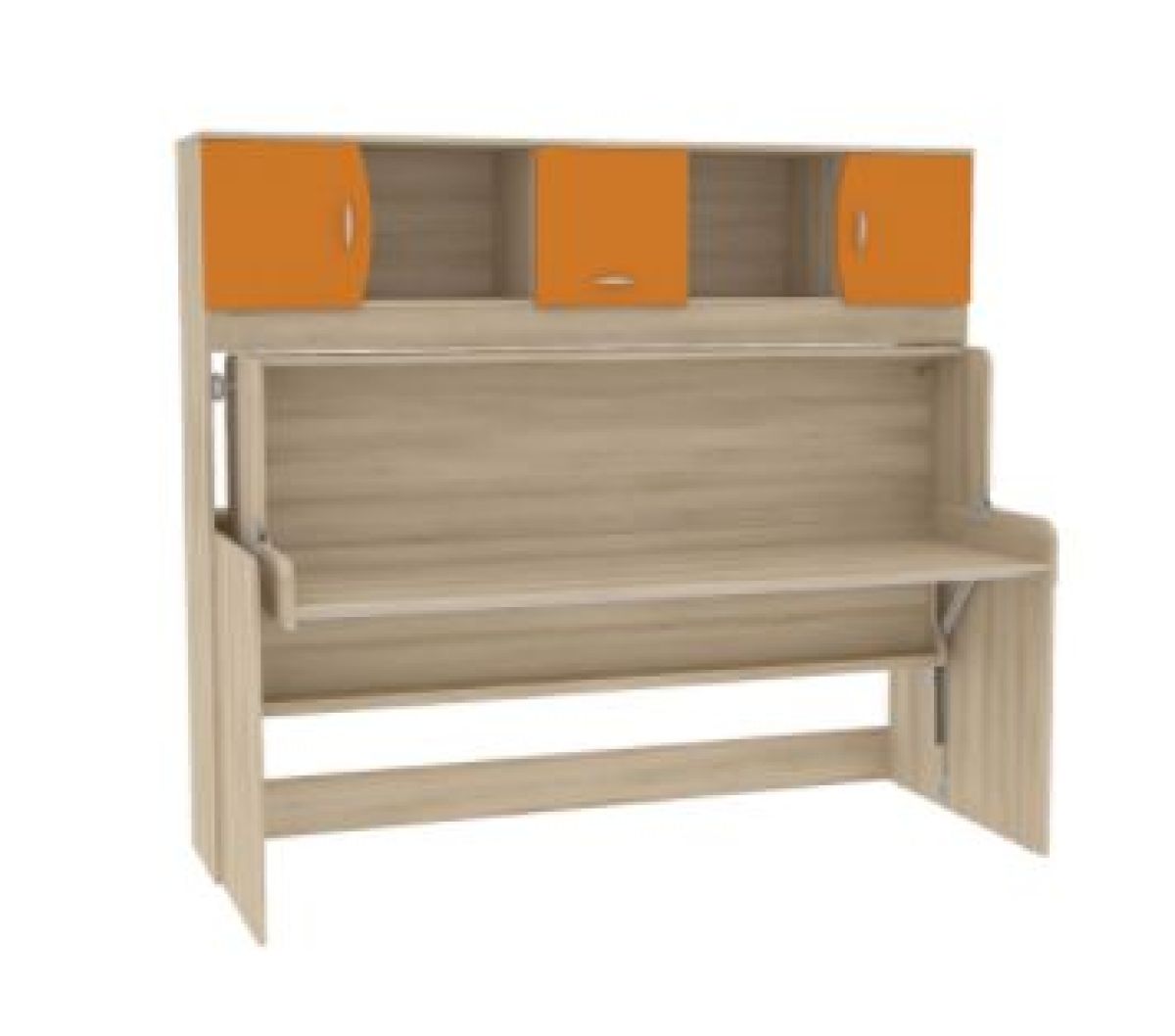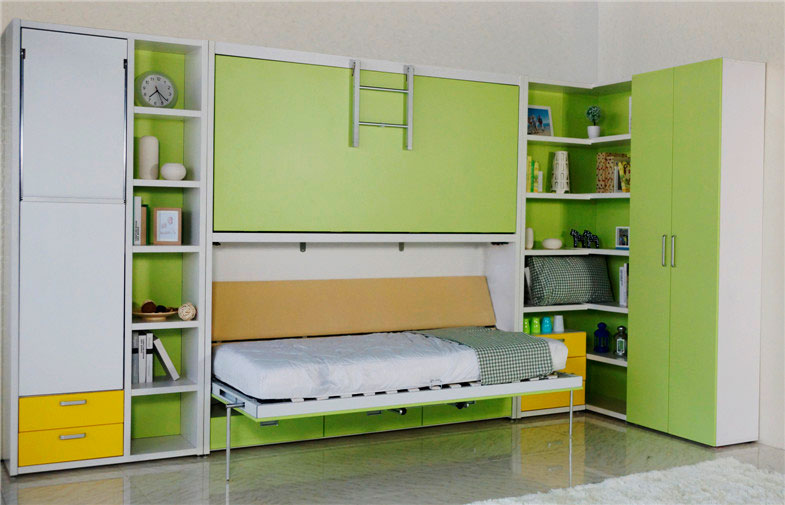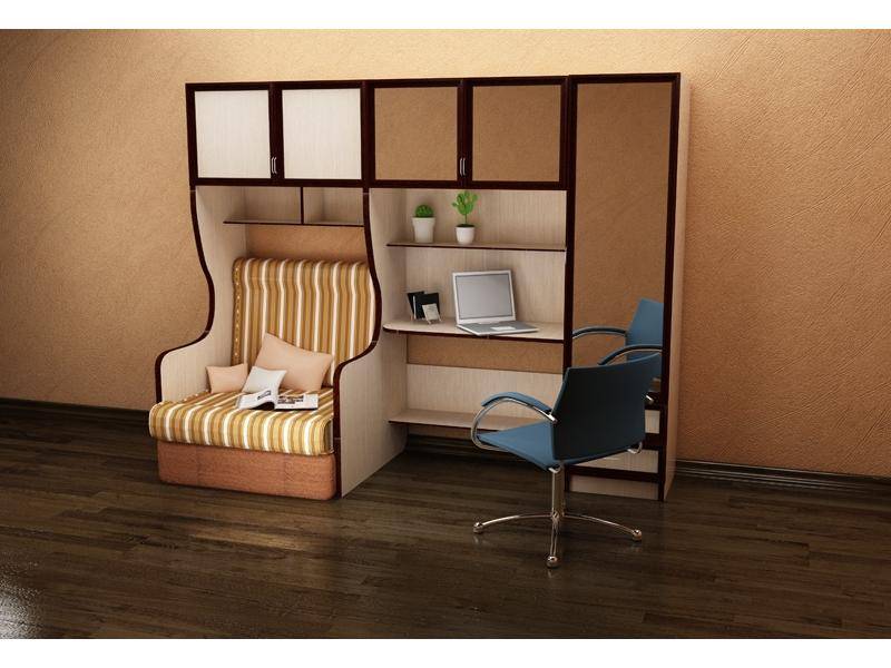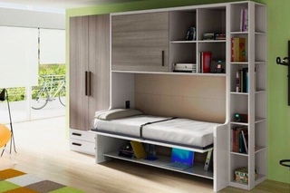 На одном участке пространства устанавливается кровать, перевернув или подняв которую вы получите удобный письменный стол со всеми необходимыми дополнениями. Дополнения чаще всего представлены в виде выдвижных ящиков и тумбочек для хранения мелких вещей, канцелярии и книг.
