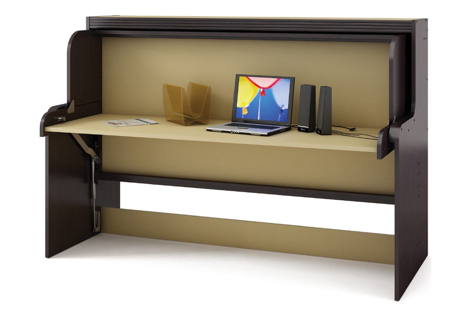 Основание кровати при перевороте становится частью стенки, на которую можно подвесить монитор от компьютера и не убирать его перед раскладыванием кровати.