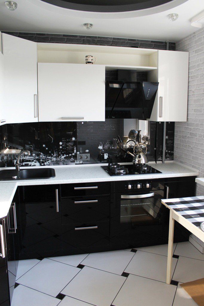 Для отделки фартука рекомендуется использовать керамическую плитку или жаропрочное стекло. Однотонная поверхность белого или чёрного цвета — универсальный вариант. Выделить фартук можно при помощи фотопечати. Самые подходящие сюжеты изображений для чёрно-белой кухни: