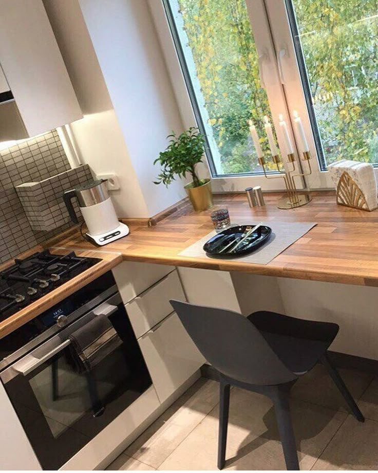 Если у вас маленькая кухня, около окна можно сделать барную стойку. Идеально, если при этом её столешница и столешница кухонного гарнитура будут выполнены из одного и того же материала, с одинаковым дизайном.