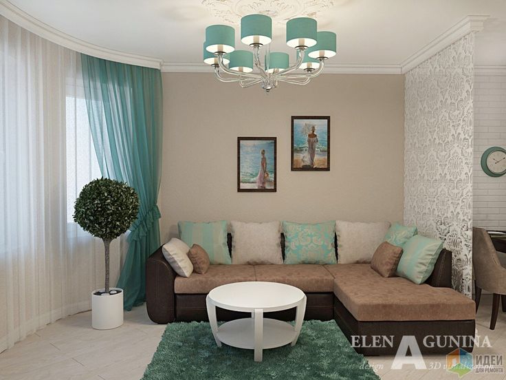 Для небольшого по площади помещения идеально подойдет вариация с единым цветом стен и мебели, в этом случае диваны и кресла подбираются примерно в идентичном цвете со стенами. Но чтобы вся композиция не смотрелась скучновато, дизайнеры рекомендуют подбирать в такие помещения аксессуары ярких оттенков, это могут быть цветные диванные подушки, броская картина, живые розовые цветы в вазе или просто розовые или желтые вазочки. Текстиль также играет не последнюю роль в оформляемом помещении, сюда гармонично впишется бежевый напольный ковер, а также мятного оттенка шторы.