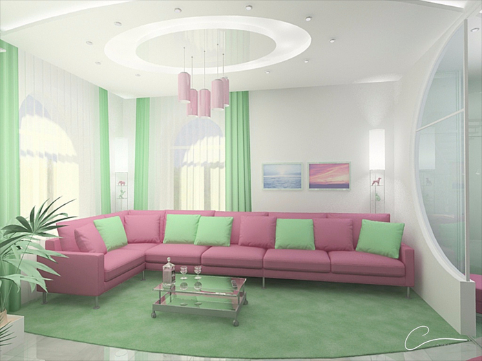 Кроме того стены можно покрыть жидкими обоями мятного цвета с мерцающими частицами или обратить внимание на соответствующую декоративную штукатурку. С таким цветом стен чудесно смотрится белая, коричневая, бежевая, черная, розовая или желтая мебель. Соответственно, если Вы любите неброскую классику, то присмотритесь к белоснежным или бежевым диванам, если обожаете яркость бытия, то смело приобретайте желтый или розовый диван.