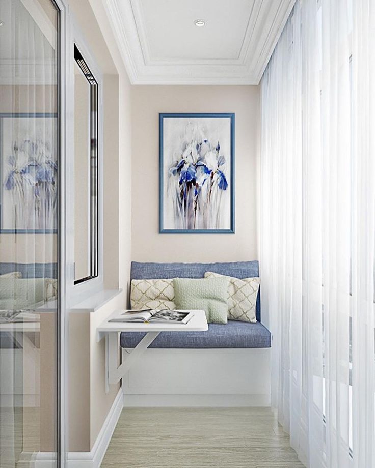 Оснащается тахтой либо креслом-грушей, которое занимает мало места, приспосабливается под человека, обеспечивая комфортный отдых. Маленького размера столик сделает досуг еще приятнее, позволит выпить чаю на балконе, позавтракать и даже посмотреть фильмы на ноутбуке.