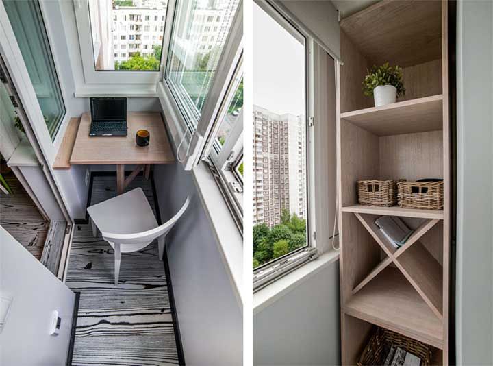 В малогабаритных квартирах довольно распространена идея использовать балкон не только для хранения вещей, но и как домашний офис.