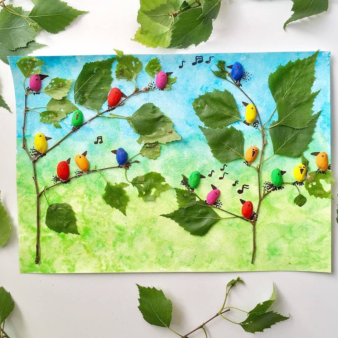 Из пожелтевших листиков березы, тополя или вяза получаются отличные цыплята. Клювики и ножки делаем из тоненьких веточек или еловых иголок. «Рассыпаем» по бумаге семена для наших домашних птичек, пространство вокруг декорируем сухими травами и цветами.