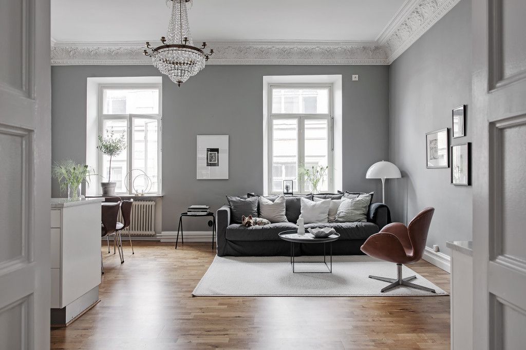 Для того чтобы не получить слишком холодный, мертвенно серый интерьер, его лучше разбавить, экспериментируя с тёплой палитрой покрытия стен, либо внести в него мебель из правильно подобранных сортов древесины.