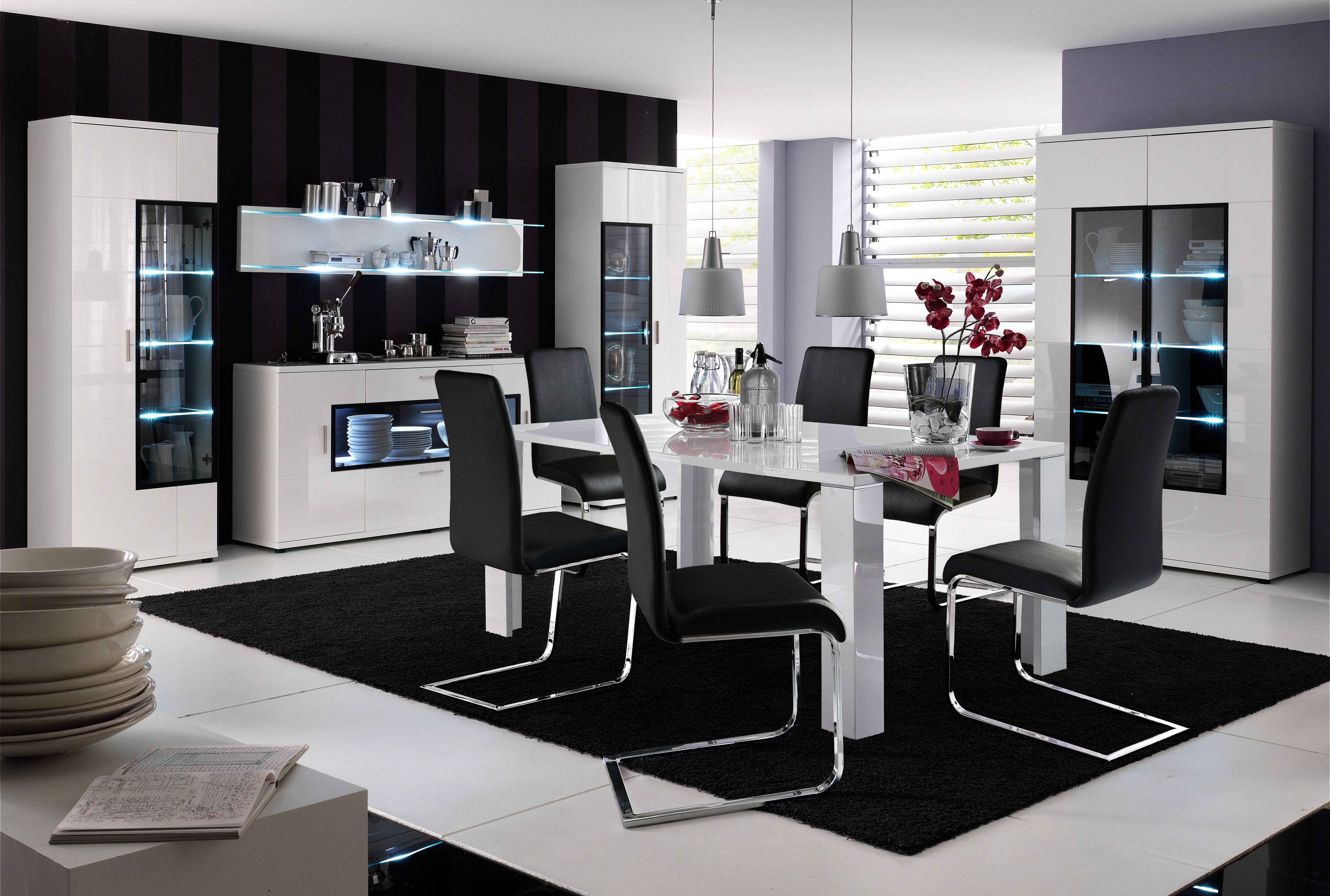 Главным акцентом такого интерьера может стать большая сверкающая люстра. Дополнительными источниками света могут быть галогенные лампы или прожекторы, а также светодиодное освещение, которое не только придает помещению футуристический вид, но и позволяет направленно освещать необходимое пространство.
