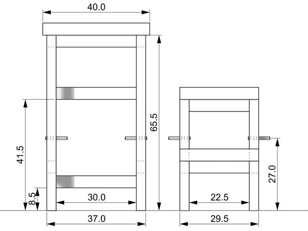 Также важно учитывать, что у изделий выше 50 см, должны присутствовать перекладины для ног. В этом случае расстояние от подставки для ног до сиденья должно составлять, как и для обычного табурета 42-48 см.