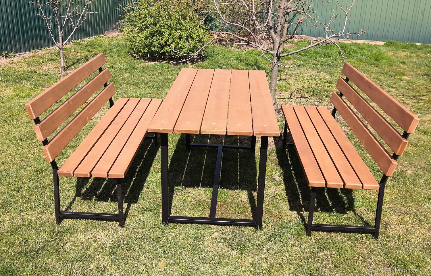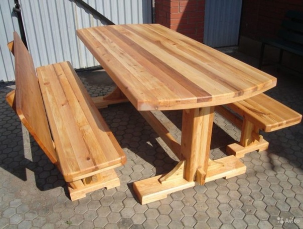 Стол и скамейки в одной конструкцииМодель из дерева со спинкойДеревянная лавочка без спинкиДеревянные скамейки имеют простую конструкцию и быстро собираются.