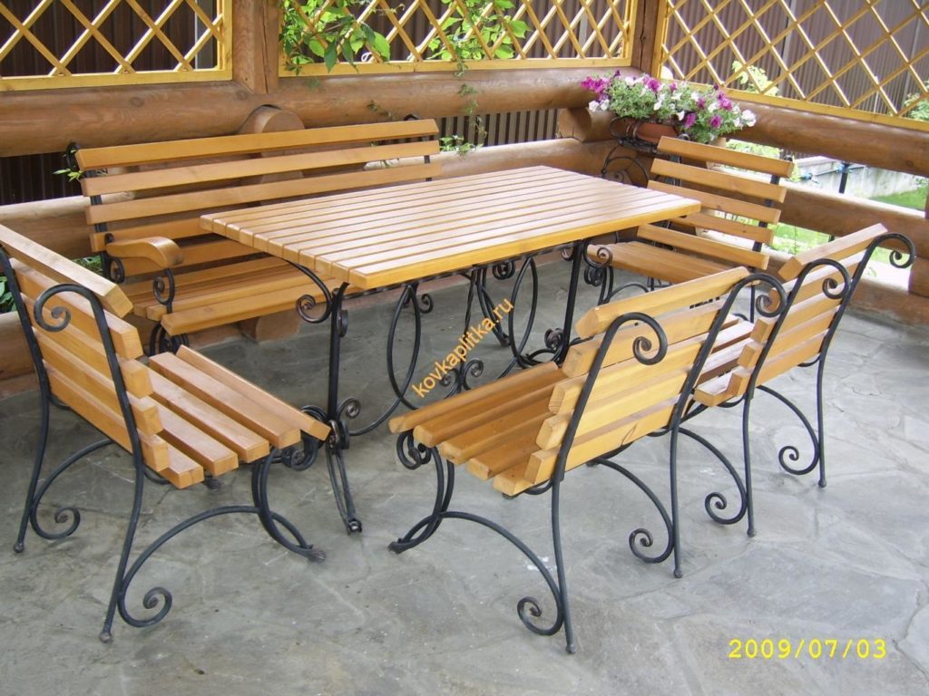 Должны соответствовать стилю дома, так как их размещают перед входом. Гармонично смотрится кованая скамейка, детали которой аналогичны элементам забора, крыльца или ставен (варианты кованной мебели представлены на нашем сайте).
