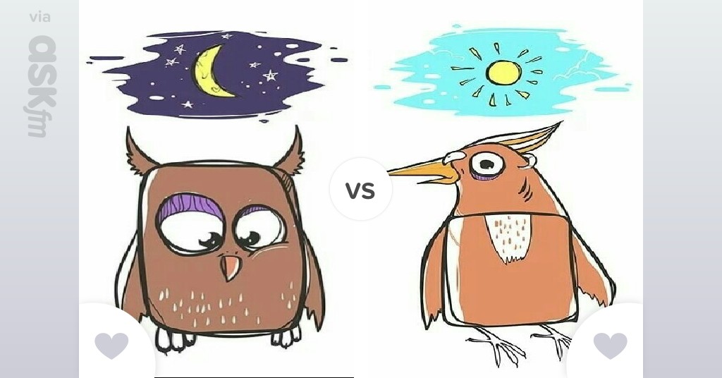 Ночные совы также, кажется, демонстрируют большую вариацию пиковой производительности в течение дня, что позволяет предположить, что они могут быть более чувствительны к изменениям времени суток, чем жаворонки.Например, сова, соревнующаяся с утренним жаворонком в 8 часов утра, будет более ослаблена, чем жаворонок, соревнующийся с совой в 8 часов вечера.