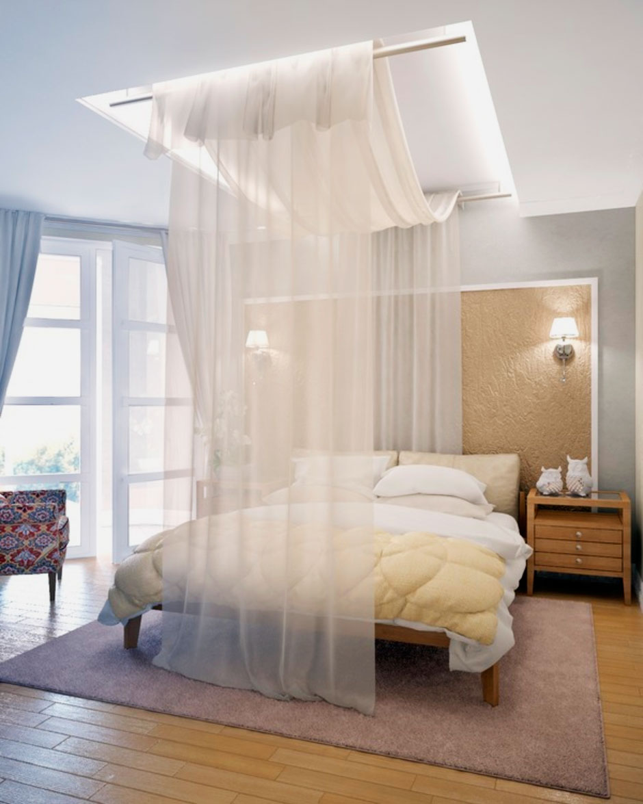 Для этих целей с давних времен используются кровати с балдахином (от итал. baldacchino — «шёлковая ткань из Багдада») – специальным навесом над ложем.
