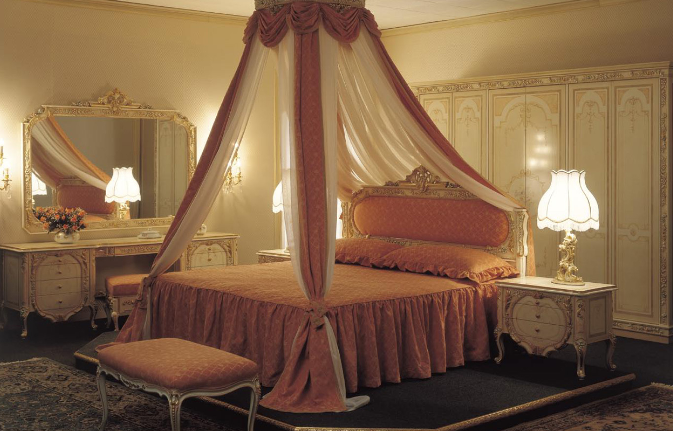 Плотные ткани для создания полога над ложем используются в стилях, где традиционно присутствует элемент роскоши, а порой и высокопарности: например, в арт-деко, дворцовом, барокко.