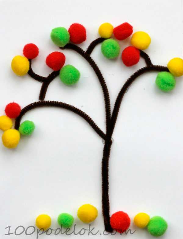 Оригинальное дерево может получится из помпонов и пушистой проволоки (синели). Ствол и ветви сформируйте из синели и приклейте к бумаге. Вокруг веточек разместите разноцветные помпоны.