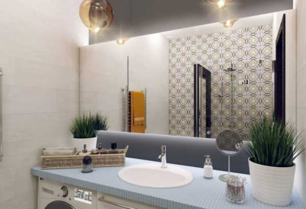 По одной стене располагается столешница со встроенной раковиной, над ней – зеркало во всю стену. Под столешницу встроена стиральная машина, а также имеется небольшая система хранения. Там же «прячется» бельевая корзина.