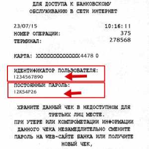 - Пластиковой карты (при условии что известен пин-код). Запрос идентификатора и пароля для входа делается через терминал или банкомат.