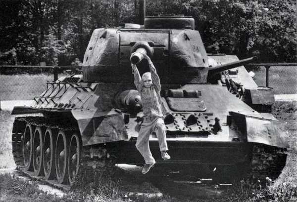 Мальчик играет на танке у мемориала погибшим войнам. Подмосковье 1993 год.