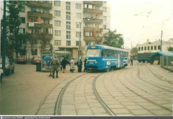Вид с Ваганьковского путепровода на Беговую улицу. В 2000 году тут была трамвайная линия.