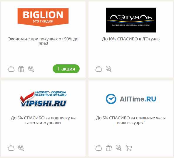 По существующим условиям благодарственной программы крупные организации могут выступать и в роли временных партнеров Сбера. Такие предприятия периодически устраивают акции, где за кэшбэки можно приобрести промокоды и скидочные купоны. Собственные бонус-акции предлагают участникам «Спасибо» и иные компании. Например: