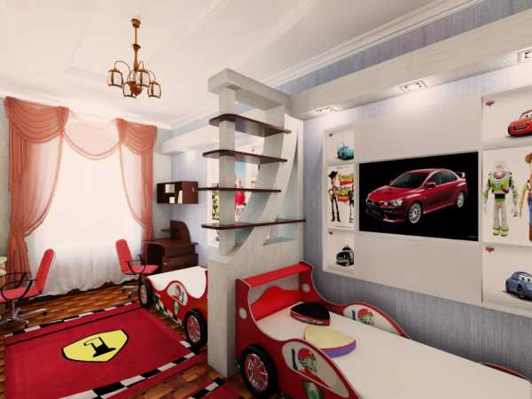 Разграничение детской на зоны создаётся с помощью отделки, штор, стеллажей, декоративных перегородок из гипсокартона.