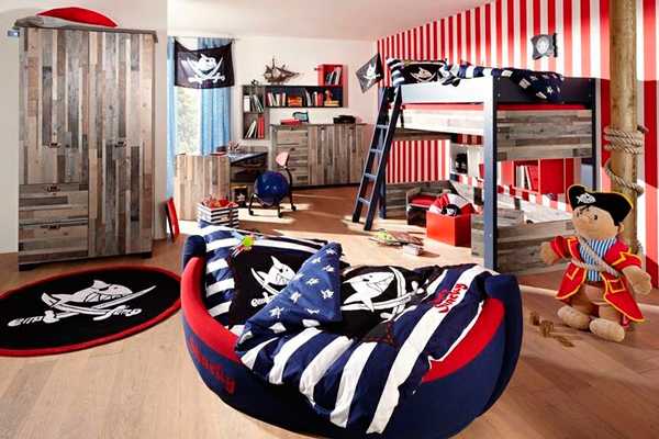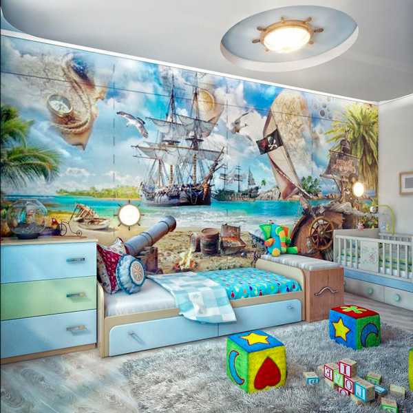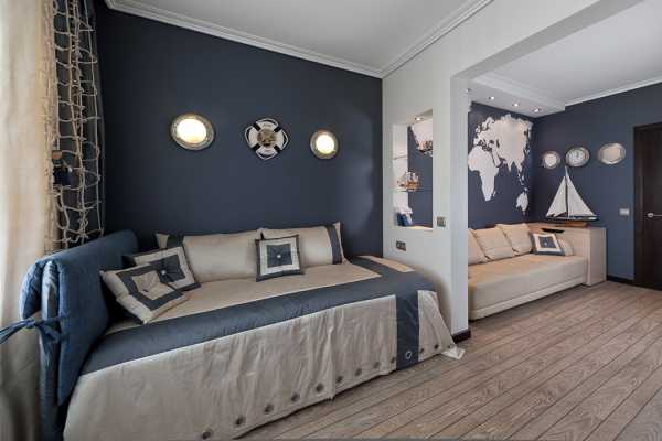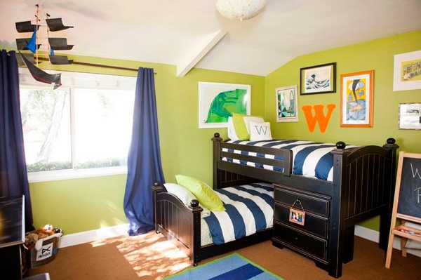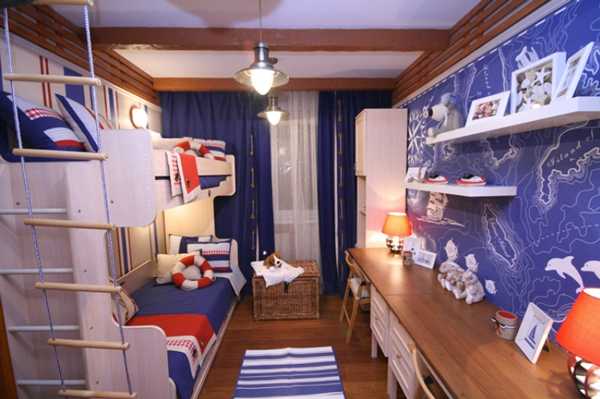 Если детская оформлена в определённом стиле, то использование тематических атрибутов интерьера неизбежны. А что если одному из мальчиков нравится море, а другой увлекается футболом? Тогда можно использовать и аквариум, и модель парусника, и глобус, и фото любимой футбольной команды.