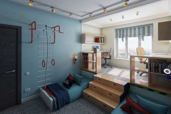 Большое внимание уделяется спортивному уголку — братья оценят такой дизайн комнаты