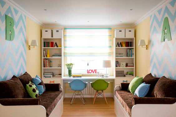 Если площадь помещения позволяет, можно создать в ней две комнаты с учетом преимуществ каждого ребенка в отдельности. Не обязательно громоздить между ними глухую стену, даже если эти комнаты будут кардинально отличаться по стилевому направлению и мебельному наполнению.