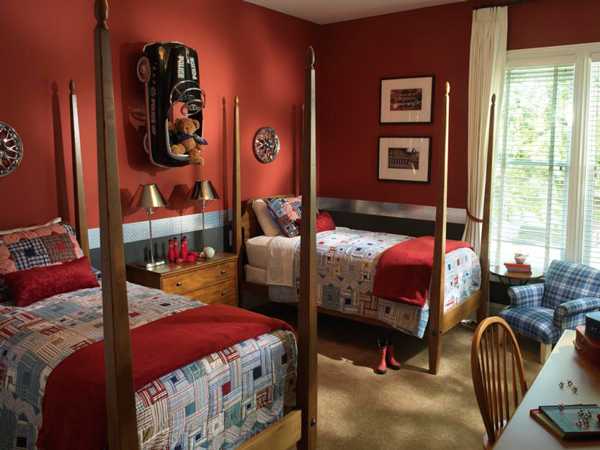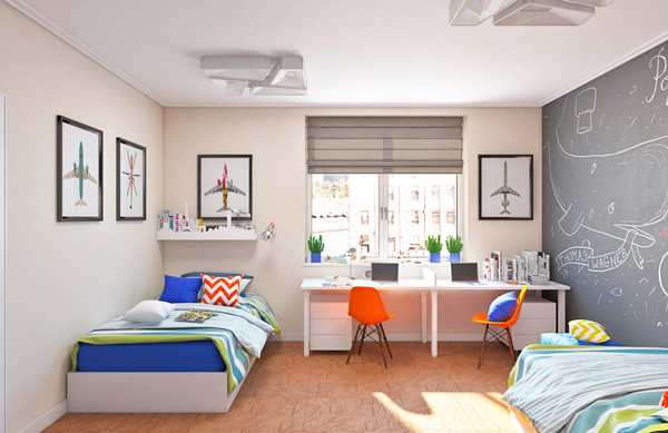 В комнате подростков нет ограничений по совместительству цветов – здесь все уместно, даже самые несуразные сочетания. Единственное ограничение – не нужно делать ее однотонной. Это не соответствует детскому темпераменту и образу жизни, поэтому окажется слишком скучным для двух мальчиков-подростков.