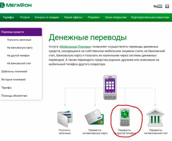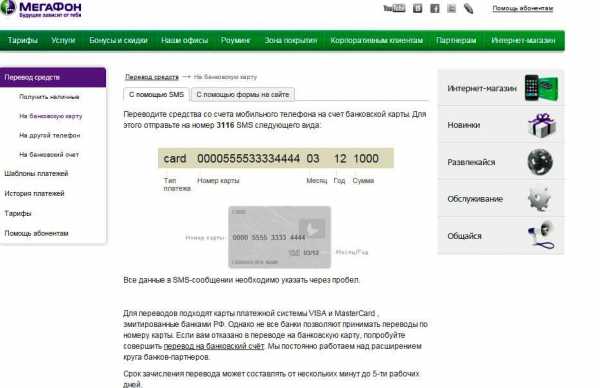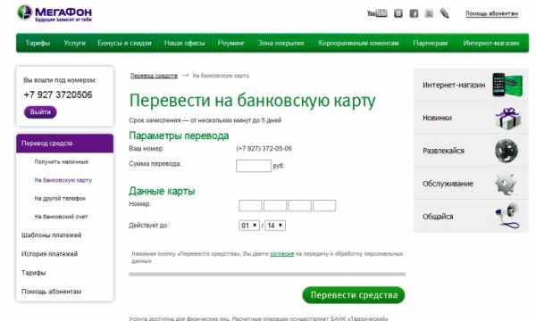 Пример перевода на банковскую картуЕсли необходимо сделать перевод внутри сети или абонентам Билайн, МТС или Теле2 надо перейти на сайт компании по ссылке money.megafon.ru.