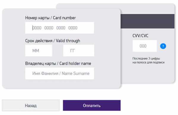 - На следующей странице заполните реквизиты банковской карты (номер карты, срок действия, данные держателя, а также CVV2-код), с которой будет осуществляться пополнение счета и перейдите к следующему шагу, нажав на соответствующую кнопку «Оплатить» фиолетового цвета.