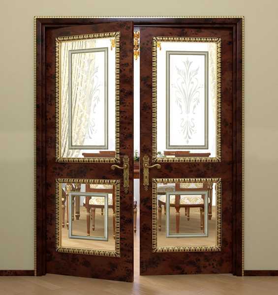 Еще один из стилей классических дверей — царский стиль «Барокко». Это дорогие межкомнатные двери из ценных пород дерева выглядят пышно, парадно за счет многочисленных кудрявых накладок и багетов, преимущественно золотого цвета.