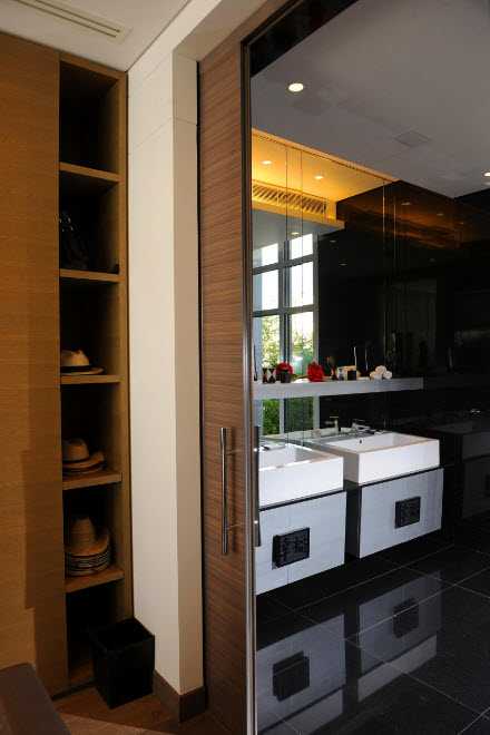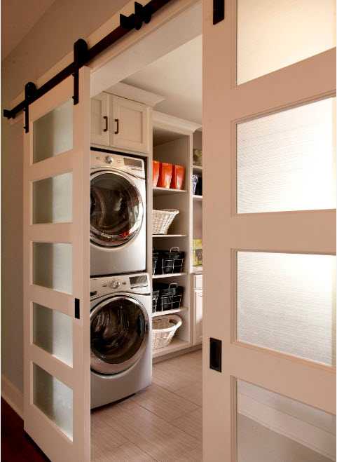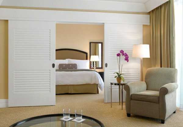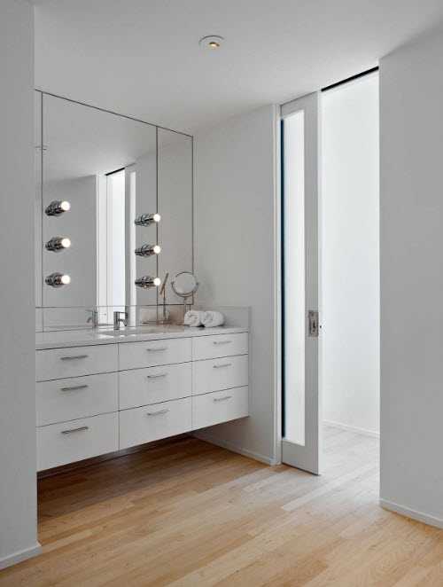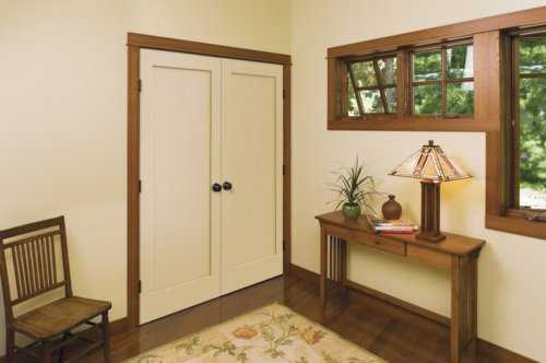 Дизайнерский прием, при котором двери в комнате выглядят в точности так же как и фасады шкафов или гардеробной зоны позволяет достичь создания гармоничного образа помещения. Двери комнаты и шкафа могут отличаться габаритами, но стилистическое исполнение и цветовой выбор должны совпадать.