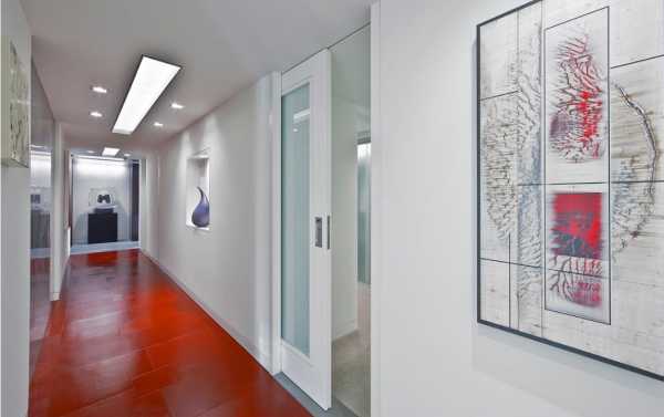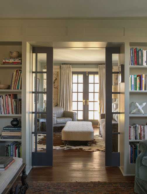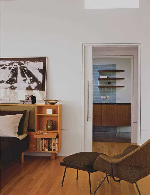 Такие двери служат частью стены и визуально продолжают комнату. Можно сказать, это отличный вариант приглушённого освещения в ночное время, если в одном из смежных помещений горит свет